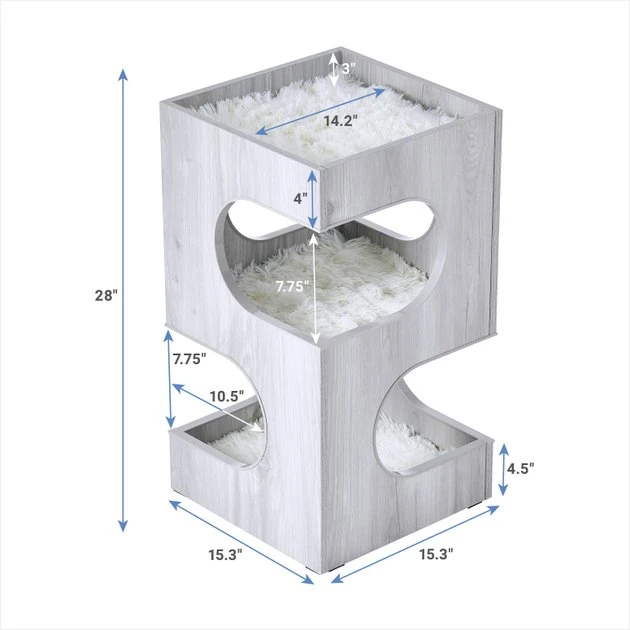 Is your kitty in the market for some prime purring real estate? This 28-inch, two-story, modern cat tree is move-in ready! Whether your kitty prefers to hang out at the โlobbyโ, the private condo or the rooftop lounge, there are so many places to chill, nap and hang out. If your cat loves keeping an eye on the action from his own private retreat, the extra-large cutout windows make for a room with a view. Add in the removable, washable cushion with luxurious eyelash โfurโ and your kitty can curl up cozy. Yes, paw-lease! Crafted with a contemporary feel in stylish white or grey wood grain, this is one cat tree youโll want to show off.