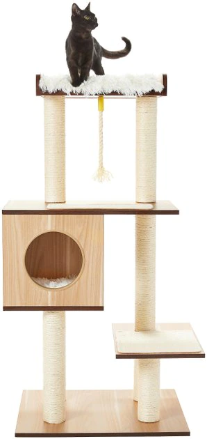 Is your kitty in the market for some prime purring real estate? This 47.5-in, four-story, high-rise cat tree is move-in ready and comes with all the amenities for kitties. There are five scratching posts fully wrapped in sisal rope, and two sisal scratching pads. Sisal feels like tree bark to catsโa felineโs favorite scratching surface out in nature. The kitty-approved design provides plenty of vertical climbing space up to a penthouse perch on the top floor, and a cozy condo for when your cat needs a private retreat, with its own eyelash โfurโ cushion to level up the cozy. Crafted with a contemporary feel in stylish white or grey wood grain, this is one cat tree youโll want to show off.