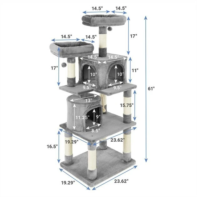 - The 61-inch cat tree features a condo and 2 top perches for lounging.