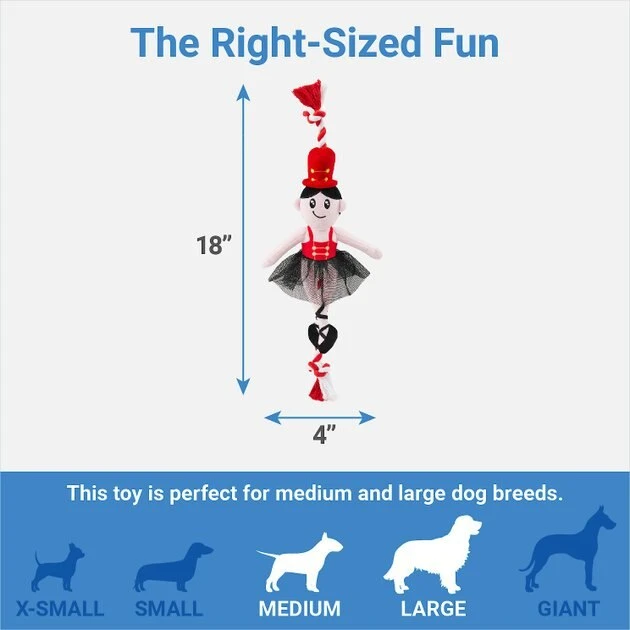 This holiday plush rope toy is sure to make your pup dance for days! Watch their tail wag as they fetch this ballerina from across the house. Surely, this ballerina wonโt be the only one on her toes. Featuring a sewn-in squeaker to promote playtime excitement, and a soft plush body thatโs easy on the teeth and gums. Your pooch is sure to leap along with this ballerina for the entire season and beyond.