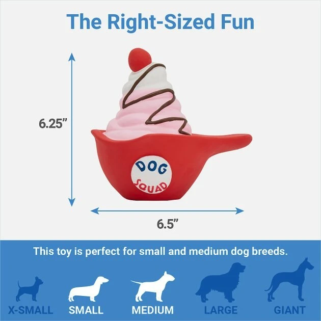 Grab a scoop or two of playtime for the big game! This latex baseball cap of ice cream brings an all-time stadium snack favorite to your pupโs toy box. The built-in squeaker encourages playtime excitement, plus itโs perfect for tossing, fetching and standing up to your pupโs daily play sessions. It’s super fun, with a cherry on top!