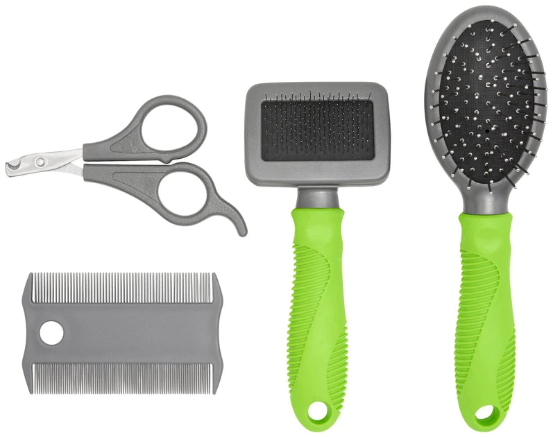 This grooming kit includes a double-sided brush, slicker brush, double sided flea comb and nail scissors.