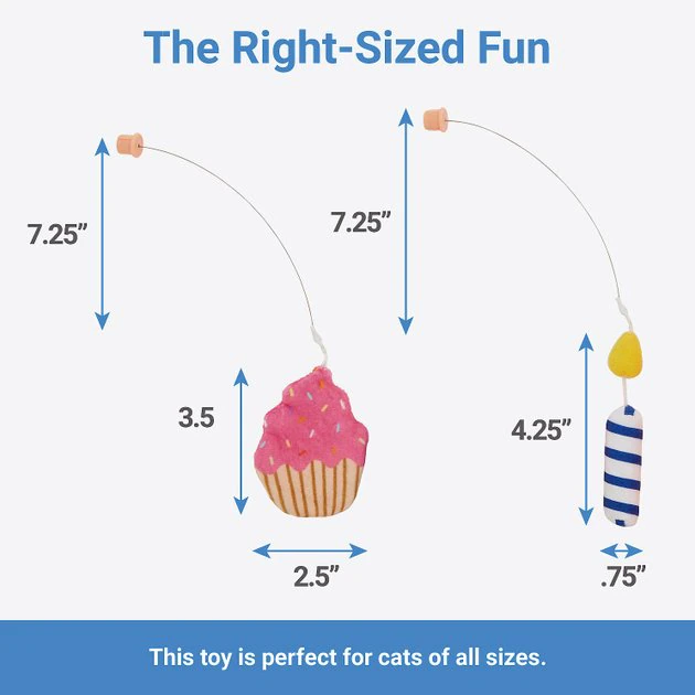 - Spinning action of the ball, rolling sound and bouncy cupcake and candle on top keeps cats engaged in play.