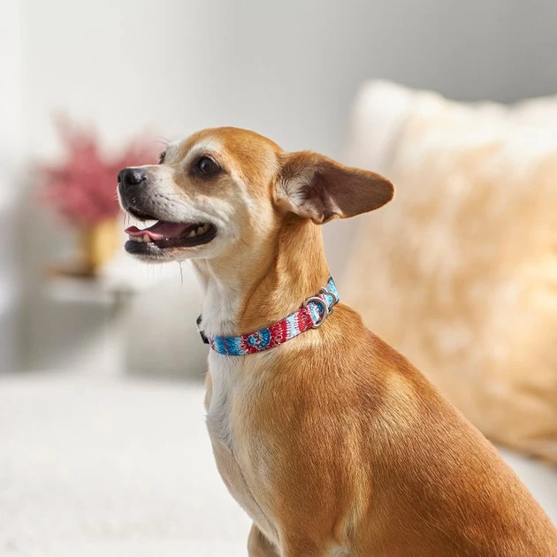 Remember to measure your pet for the paw-fect fit! Designed for everyday wear, these collars combine comfort, security and style. With their vivid tie dye design, youโll love the way your pup looks in these far-out collars. Theyโre made with durable, high-quality polyester with an Ultra-Weldโข seal, strength tested to withstand up to seven times the maximum recommended weight for each size. Easy to put on, these collars have plastic buckles with rounded edges for comfort and a nickel-coated D-ring. They come in different sizes with adjustable slides for a custom fit, even for growing puppies. Plus, all sizes come with a separate ring to attach an ID tag. And you can grab a matching leash to complete the look!