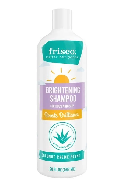 Sometimes you want your petโs coat to match their bright personality. With regular use, the Frisco Brightening Shampoo can help boost your dogโs or kittyโs natural brightness, if they have a white or light-colored coat. Itโs formulated with Aloe Vera and violet flowers to enhance light colors and contrast, while safely removing stains and conditioning fur. There are absolutely no parabens. Plus, it has a delightful Coconut Cream scent.