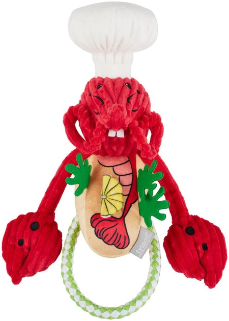 Lobster rolls are super popular at brunch and you want to make sure that your pooch doesnโt get any menu jitters at the table. It is an absolute treat during the mid-day festivities, and itโs about time that your dog gets hip to this new staple! This lobster isnโt messing around as it comes dressed to the nines in its chefโs hat and curled moustache. As if that wasnโt enough, this lobster is ready to rock and roll with three sewn-in squeakers and rope to really crank up the fun for everyone at the table.