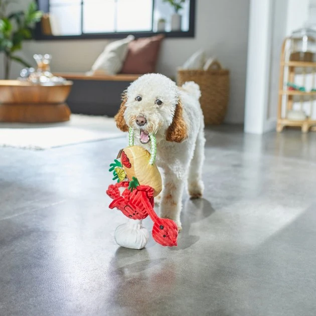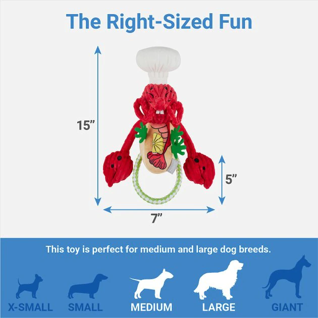- Lobster roll toy includes a sewn-in squeaker and rope thatโs sure to make your dogโs tail wag with joy.