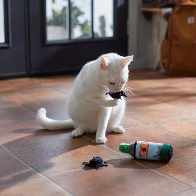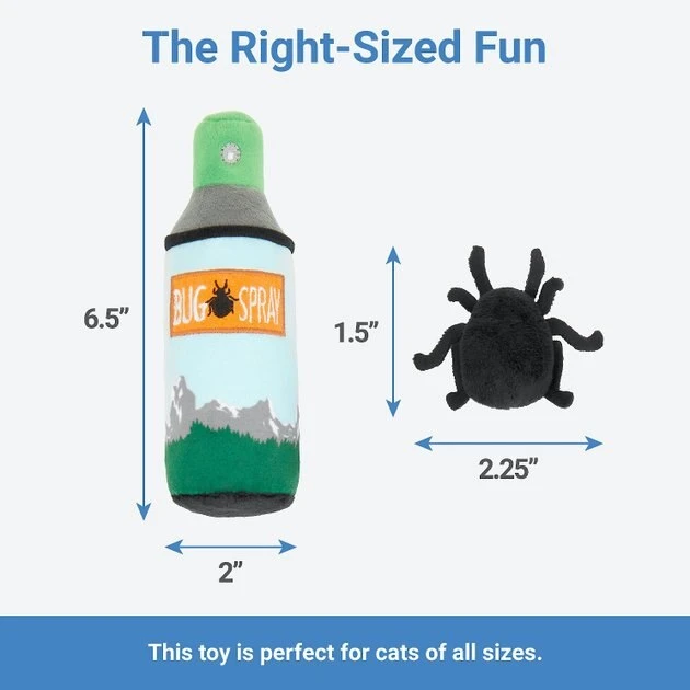 Ah, the smell of pine, the stars, and nothing but you, your kitty and the great outdoors. Oh, and this bug spray plushy filled with catnipโand the bugs that always tag along. Whether youโre prowling around the campsite or glamping on the couch, this tent-side must-have is ready to bust boredom wherever the playtime fun takes you. Made with super soft, cuddly Velboa plush, this is one toy thatโs perfect for camping out or chilling in.