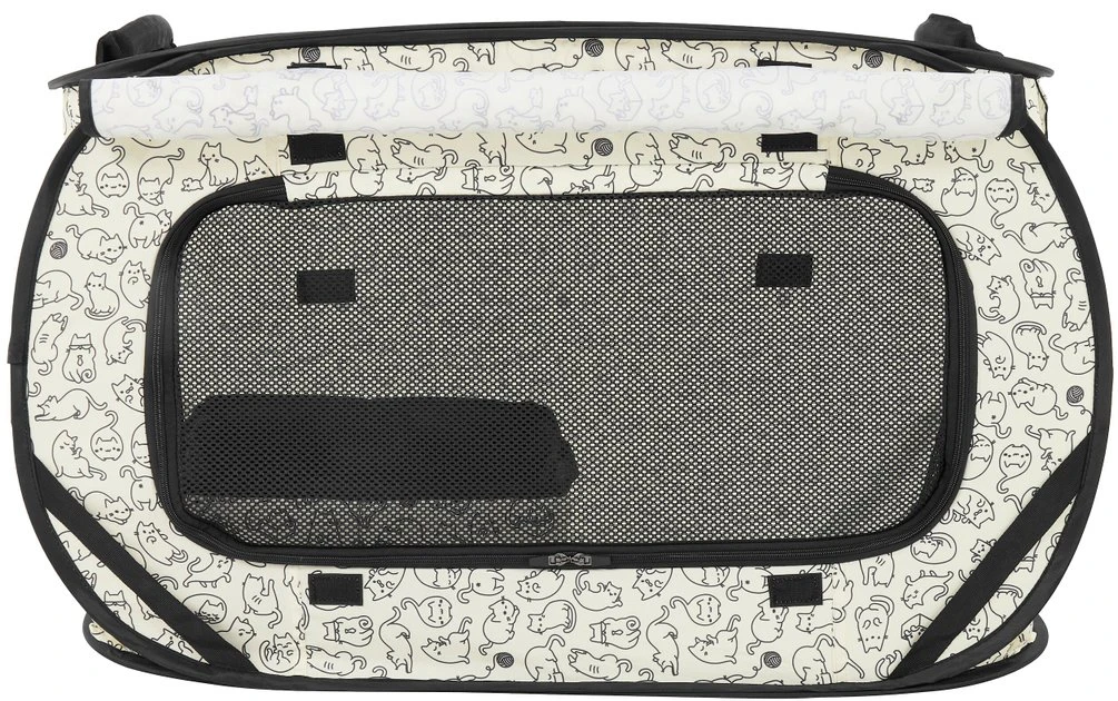 - Chic, stylish, portable cat cage available in an animal sketch pattern or black-and-white plaid.