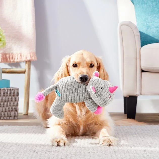 What a cuddly, squeaky cutie! Get playtime started with the Frisco Corduroy Plush Squeaking Rhino Dog Toy. It has built-in squeakers for the loud fun dogs love, and crinkle paper perfectly placed for added excitement. Made with an ultra-soft plush material with a cuddly corduroy texture, itโs also perfect for nap time.