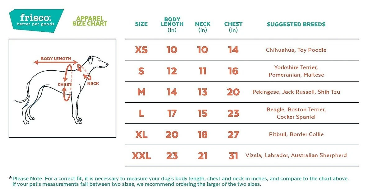 For the best fit, match the below dimensions to your pet’s measurements as closely as possible. If your pet falls somewhere between two sizes, we advise ordering the larger of the two.