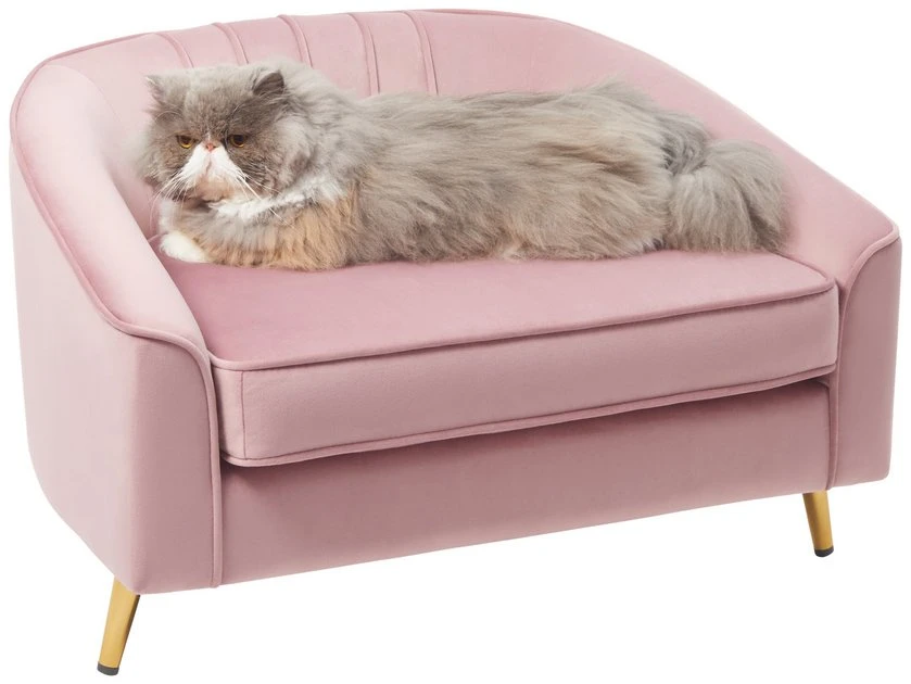 For cat naps, doggy dreams and every furry fantasy that comes alongโnaptime just had itself a major glow up! Now your pet can sleep, daydream and kick back like royalty on this amazing curved sofa. This curved piece comes complete with a velvety soft surface, padded rolled arms, soft back support and golden metal legs. And donโt worry pet parents, weโve got you covered because these sofa cushions are removable for easy spot cleaning whenever itโs time to spruce things up. Available in one size for both small and medium pets, along with a variety of colors like blush pink, grey and olive green, thereโs sure to be a combination thatโll put the biggest smile on your dog or catโs face!