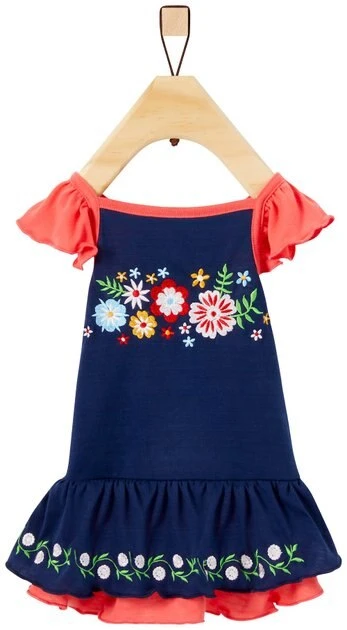 - Design features a navy blue base with red accents and embroidered flowers, making it a cute staple for your pet’s spring wardrobe.