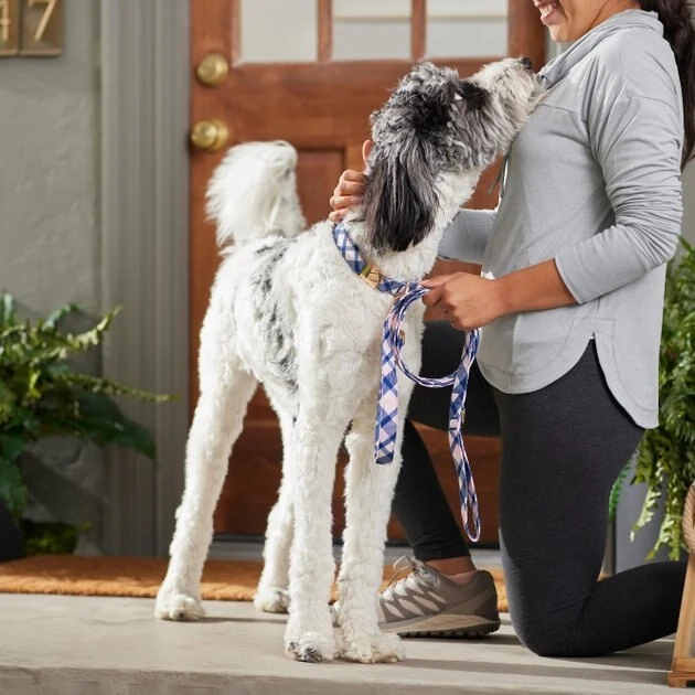 Upgrade your pupโs daily walks with a leash that combines function with a fresh twill print for fall. Made with nylon webbing, itโs the go-to leash for all your walks, jaunts and strolls. It has a handy loop to help you maneuver your pup, a gold metal snap that attaches easily to any collar or harness, and a handy D-ring to hold poop bags.