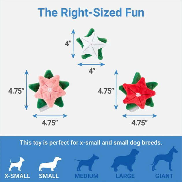 Itโs the holidays and playtime with your pup is blooming! Give your pooch the nicest plush toys with this three-pack holiday flowers toy set. This pack comes with three different kinds of flowers for three times the fun. Every toy comes with a sewn-in squeaker, so treat your dog to a good time and watch as their holiday season brightens up.