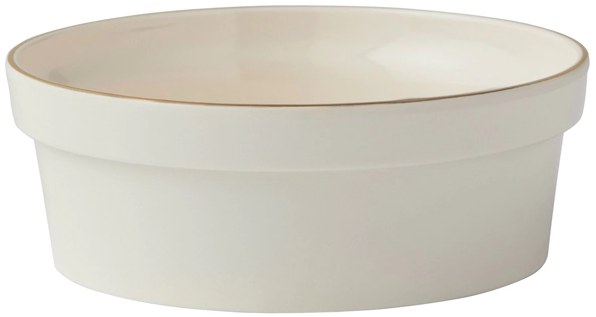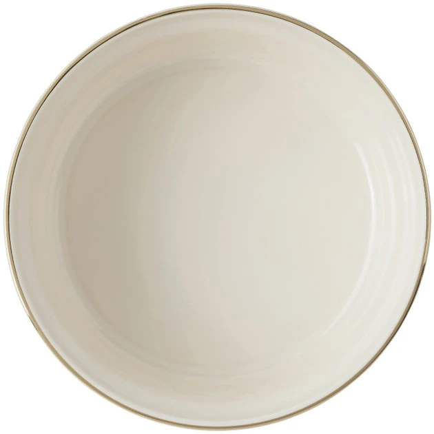 - Cream-colored melamine bowl with a tasteful gold trim accent.