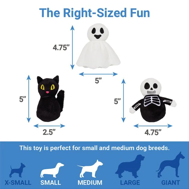- Plush puzzle toy set comes with plush haunted shack and three squeak toysโa ghost, black cat and skeleton.