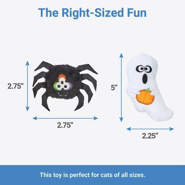 Give your kitty a Halloween treat with this duo of classic Halloween characters to get them in the spirit! This two-pack includes a ghost toy (holding a cute little pumpkin) and a big, bug-eyed spider toy that team up to bring your cat twice the fun when itโs time to play. Theyโre covered with claw-friendly fabric, plush-stuffed and infused with exciting catnip to make play seem irresistible. With this terrific twosome, your cat will be on the prowl for fun all through the Halloween season!