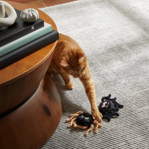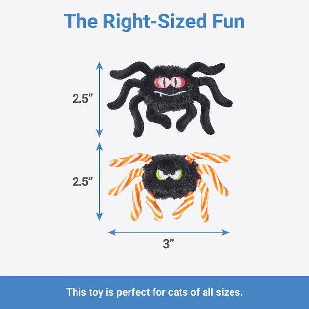 Give your kitty a Halloween treat with this duo of creepy, crawly characters to get them in the spirit! This two-pack includes two spider toys with different faces and dangly legs that team up to bring your cat twice the fun when itโs time to play. Theyโre covered with claw-friendly fabric, stuffed with plush and crinkle paper, and infused with exciting catnip to make play seem irresistible. With this terrific twosome, your cat will be on the prowl for fun all through the Halloween season!