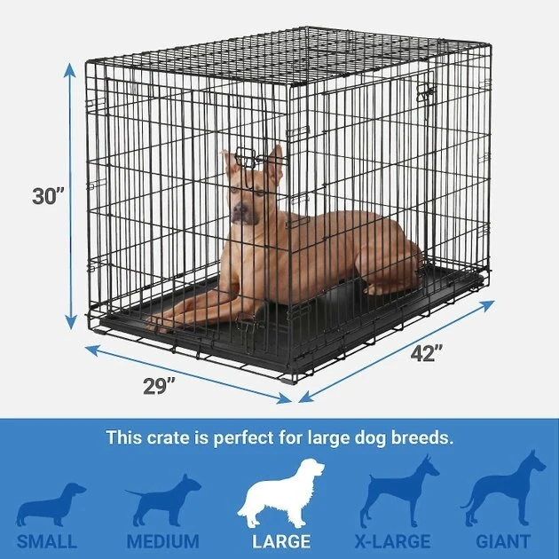 - The Frisco Heavy Duty Fold & Carry Double Door Collapsible Wire Dog Crate & Mat Kit includes heavy-duty crate, comfy crate mat, sturdy base pan and crate divider.