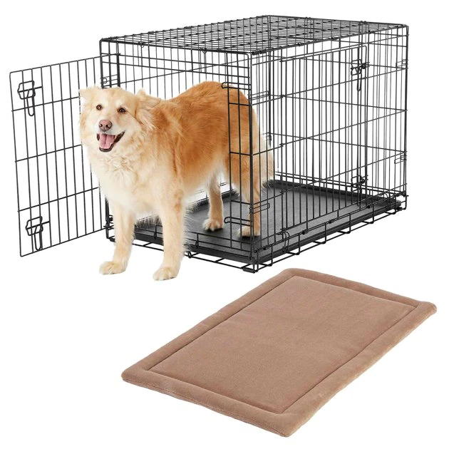 Remember to measure your pet for the paw-fect fit. Each purchase comes with the Frisco Heavy Duty Fold & Carry Double Door Collapsible Wire Dog Crate and the Taupe Frisco Micro Terry Dog Crate Mat. Paw-fect for training or keeping him safely contained while youโre away, this crate is larger with thicker and heavier wiring than standard Frisco crates for added security. Each panel is constructed with rounded corners for your pet’s safety. The two large doorsโone at the front and one on the sideโgive you more placement options in the home, and they make exit and entry a breeze in the car. The mat is a cozy addition to your furry buddyโs new crate. Itโs made with a cushioned, poly-cotton base for a layer of comfort, and the micro-terry top keeps him cool in the summer and toasty in the winter.