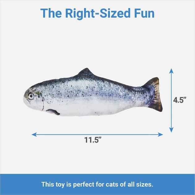 Note the interactive dancing fish toy reacts to touch and starts and stops depending on your kittyโs interaction. Have you ever seen a fish dance? Now you have! The Frisco Interactive Electric Flopping Fish Cat Toy with Catnip wiggles and bounces around, just a like real fish, to bring out your catโs inner hunter and bring on the interactive finned fun. Thereโs no fuss reeling in the good times with this fish. Just fully charge the battery pack for about an hour and a half, insert it into the plush fish, turn it on, close the belly, then watch your pal go kitty crazy on their new scaly sidekick. And the playtime lasts for almost an hour on a single charge! Hook, line and sinkerโyour cat will eat up the fishy fun with this toy. And if theyโre not ready to sink their claws in just yet, you can bait the hidden pouch inside with a little pinch of the included catnip. Thatโll entice your cat to do some fishing for sure. With this floppy, dancing friend from Frisco, your kitty can really cut a rug!
