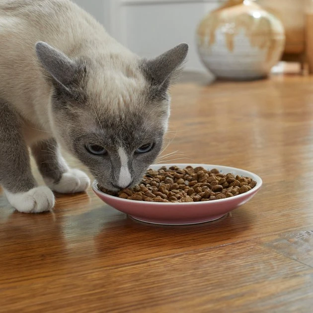 For the color-loving kitty parent, this saucer-style cat dish is purr-fect! Outside, thereโs a splash of poppy pink to brighten up your catโs dinnerware. Inside, thereโs a neat kaleidoscope pattern to add even more paw-sonality to your kittyโs meals. With this dish, youโre not only serving up dinner, youโre serving up style, too! Plus, it has a non-skid base to help keep mealtime messiness under control.