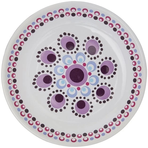 - Bright, poppy ceramic cat dish with solid purple around the outside.