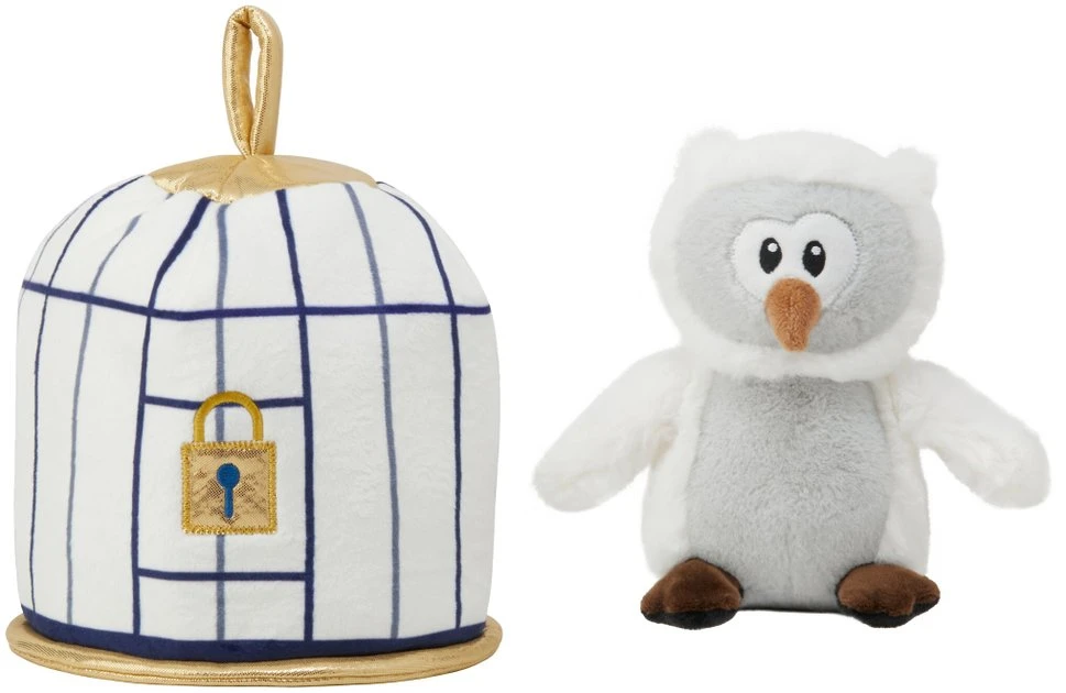 - Two toys in oneโa plushy bird cage and an owl with squeakers and crinkle paper inside.