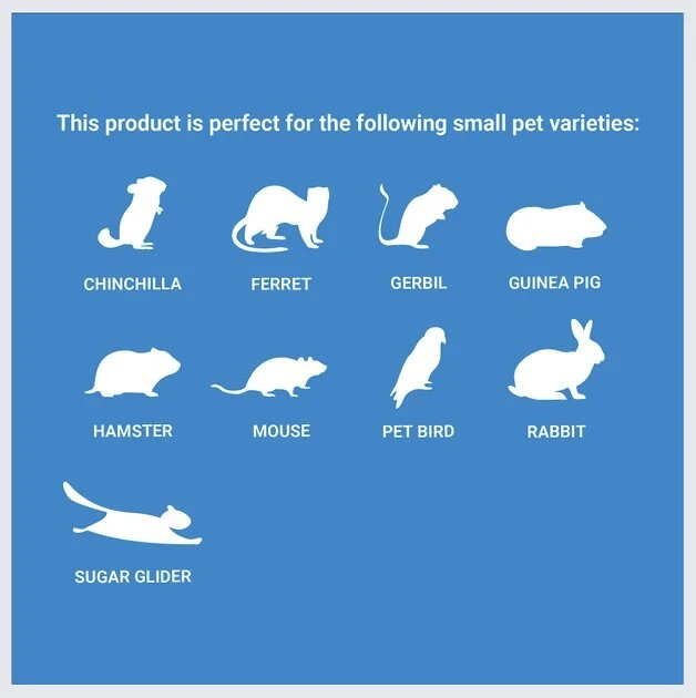 | Small Pet Type | Ferret, Rabbit, Guinea Pig, Mouse, Hamster, Gerbil, Sugar Glider, Chinchilla |