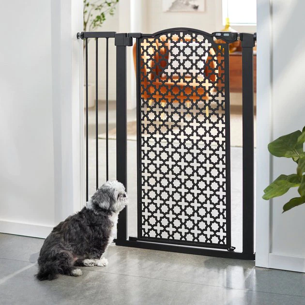 Check out the Size tab to be sure this gate fits your doorway. Turn any room in your home into an extra-tall-pet safe zone with the Frisco Metal Pattern Extra Tall Auto-Close Pet Gate. With its durable, metal construction, this gate is designed to keep your petโespecially your large or giant breed dogโsafely contained; and with its cool, geometric pattern, itโs sure to make a stylish addition to your home. Simply install it in a door frame or hallway to provide your pet with a place all their own. The pressure mount system makes setting it up and taking it down easy, so you can move it to different areas of the house as needed. The gate door works double duty by staying open when you need it toโjust open it past 90 degrees to lock it openโor otherwise closing on its own. You can also set up the door to open on either side. The dual-lock safety release means your pal canโt get crafty and open the door, adding a layer of security. Plus, this gate is lightweight so you can transport it and store it easily.