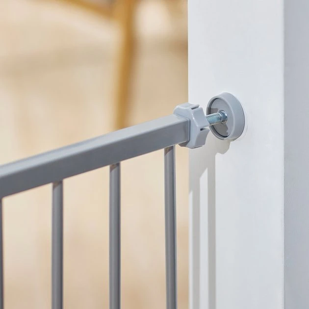 Check out the Size tab to be sure this gate fits your doorway. Turn any room in your home into a pet-safe zone with the Frisco Metal Pattern Extra Wide Auto-Close Pet Gate. With its durable, metal construction, this gate is designed to keep your pet safely contained; and with its cool, geometric pattern, itโs sure to make a stylish addition to your home. Simply install it in a door frame or hallway to provide your pet with a place all their own. The pressure mount system makes setting it up and taking it down easy, so you can move it to different areas of the house as needed. The gate door works double duty by staying open when you need it toโjust open it past 90 degrees to lock it openโor otherwise closing on its own. You can also set up the door to open on either side. The dual-lock safety release means your pal canโt get crafty and open the door, adding a layer of security. Plus, this gate is lightweight so you can transport it and store it easily.