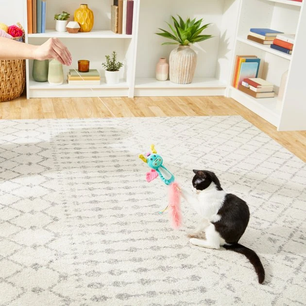 This mythical beast brings on the bouncy for your kitty. Slip the ring over your finger and make it bob up and down with the bungee cord. With crinkly materials and catnip, itโs designed to entice bored felines to jump into play. Leap, actually! Cats love batting it and biting on the plush material and feathers when they capture this playtime โpreyโ. By stimulating catsโ natural hunting instincts, itโs the perfect way to provide daily exercise. Playing together also helps strengthen the bond between you and your kitty, on the daily.