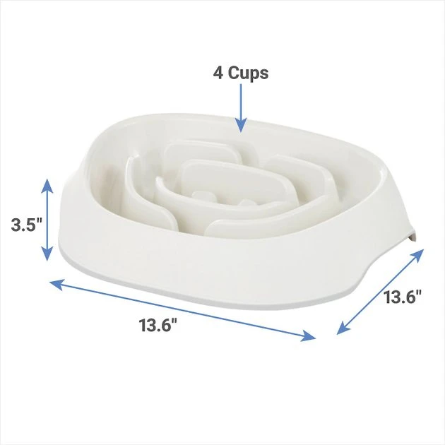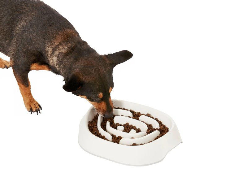 - Lengthen mealtime with this slow feeder. Puzzle-like ridges break up eating surface so dogs have to slow down to eat, and slanted bowl angle for a more comfortable eating position.