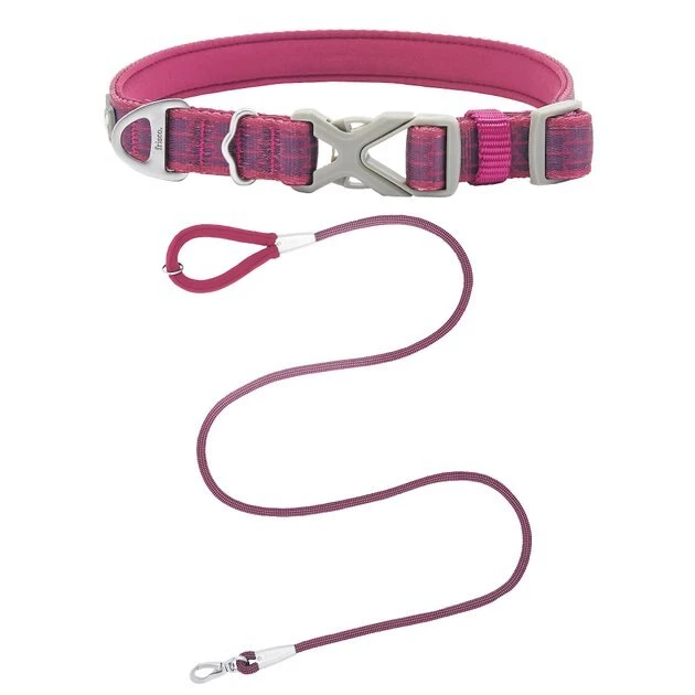 Explore the great outdoors with this Frisco Outdoor Comfort Print Nylon Padded Collar, Large, Neck: 18 -26-in, Width: 1-in + Outdoor Ultra Reflective Rope Leash With Padded Handle, Boysenberry Purple, 6 – ft bundle! The collar features a printed, brick-like design and is padded on the inside to ensure comfort and help reduce irritation from rubbing. Itโs paw-fect for the outdoorsy pup in your life, with improved features designed just for the trail, like a D-ring and a separate tag ring, too. Attach the included leash using the lobster clip. This leash is just like a classic rope leash with durable, secure nylon rope with ultra-reflective accents to increase your dogโs low-light visibility. That means safer dusk and nighttime walks. The loop handle has extra padding, so it feels great wrapped around your wrist or in your hand. This bundle is grrr-eat for all your outdoor ex-paw-ditions!