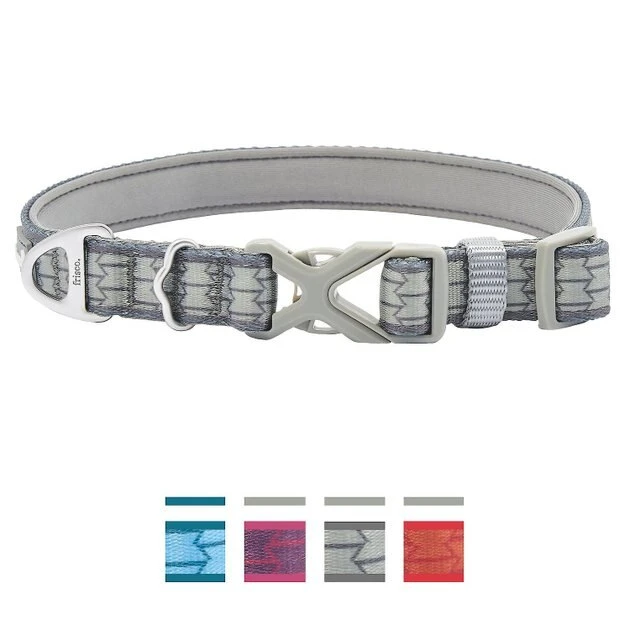 Explore the great outdoors with this Frisco Outdoor Comfort Print Nylon Padded Collar, Large, Neck: 18 -26-in, Width: 1-in + Outdoor Ultra Reflective Rope Leash With Padded Handle, Stone Gray, 6 – ft bundle! The collar features a printed, brick-like design and is padded on the inside to ensure comfort and help reduce irritation from rubbing. Itโs paw-fect for the outdoorsy pup in your life, with improved features designed just for the trail, like a D-ring and a separate tag ring, too. Attach the included leash using the lobster clip. This leash is just like a classic rope leash with durable, secure nylon rope with ultra-reflective accents to increase your dogโs low-light visibility. That means safer dusk and nighttime walks. The loop handle has extra padding, so it feels great wrapped around your wrist or in your hand. This bundle is grrr-eat for all your outdoor ex-paw-ditions!