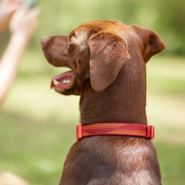 Get your pup geared up for the great outdoors with this Frisco Outdoor Woven Jacquard Nylon Dog Collar, Flamepoint Orange, Large, Neck: 18 -26-in, Width: 1-in + Ultra Reflective Rope Leash With Padded Handle, Sunset Orange, 6 – ft bundle! The collar is made from a woven nylon material for added durability and style that everyone on the trail will notice. Itโs perfect for the outdoorsiest of pups, with a D-ring for secure leash attachment and a separate ring for their tags too. The included leash is just like a classic rope leash and is made with durable, secure nylon rope with ultra-reflective accents to increase your dogโs low-light visibility. That means safer dusk and nighttime walks. The loop handle has extra padding, so it feels great wrapped around your wrist or in your hand. And the end features a lobster clasp to keep your dog securely leashed while youโre enjoying the outdoors.