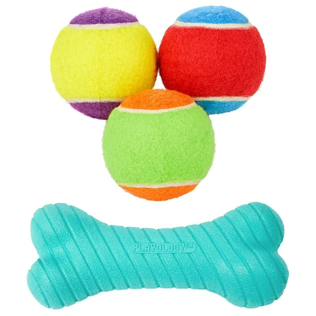 Keep your dog engaged throughout playtime when you pair Frisco Fetch Squeaking Colorful Tennis Ball Dog Toys with the Playology All Natural Dual Layer Bone Dog Toy! Whether youโre playing singles or doubles, these squeaking tennis balls are sure to turn up the fun. Unlike regular tennis balls though, these are covered with non-abrasive felt thatโs gentle on dogsโ teeth and gums when they catch them. And this unique bone-shaped toy is the paw-fect way to keep your pup entertained, thanks to the dual layer, rigid design and unique peanut butter smell.