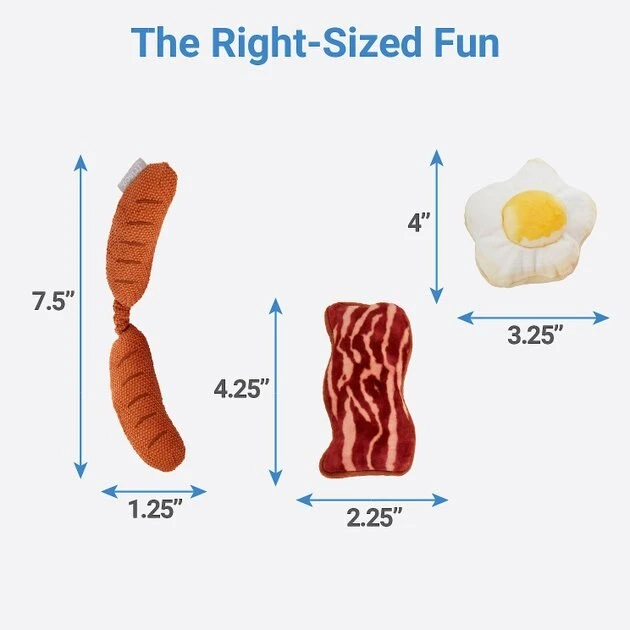 - Includes a plushy fried egg, bacon and sausage link toy to match your catโs taste.