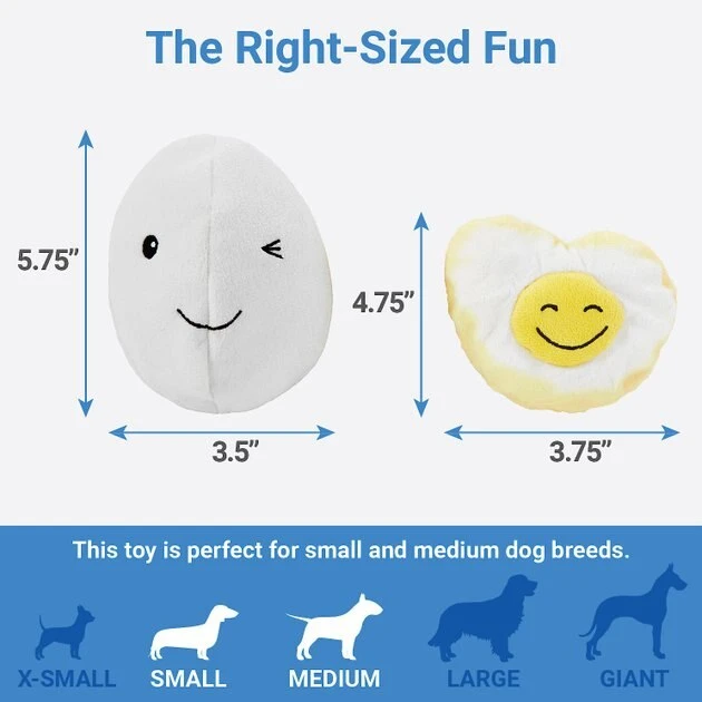 - A toy designed to be destroyed โ let your dog tear the outer egg shell to reveal the smiling egg yolk side.