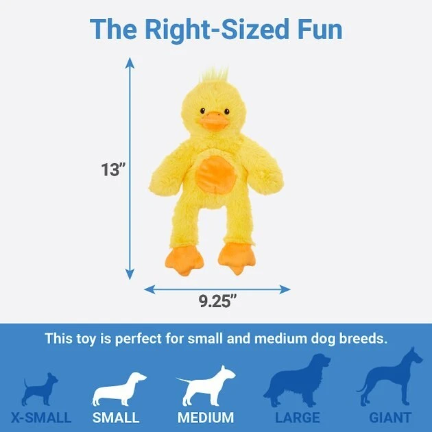 Toss, squeak, repeatโbring on all your pupโs favorite games with the Frisco Plush with Inside Rope Squeaking Duck Dog Toy. Itโs two of dogsโ favorite things in oneโsoft plush and a fun rope throughout. The built-in squeaker is sure to get your canine companion excited for play, while the soft outer fabric is perfectly suitable for plenty of snuggling. Plus, a minimal amount of stuffing means just the right amount of plush for tossing and playing fetch.