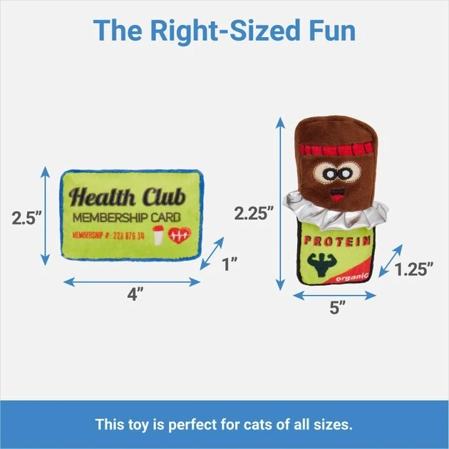 - Protein bar and gym membership plush cat toys include crinkle paper and catnip to really boost playtime and get that body moving.