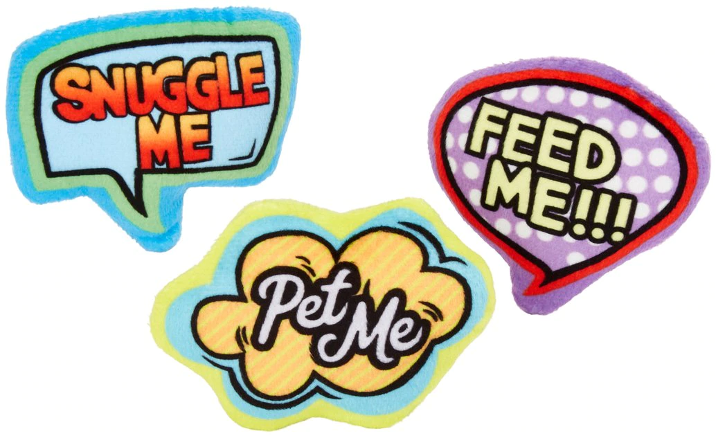 Bang! Whoosh! These comic book bubble cat toys send your cat zooming into a frenzy of retro fun like no other toy can. This three-pack of comic-themed toys each has a plush, clawable fabric cover with enticing, exciting catnip stuffed inside that will drive your cat wild during playtime. Add some retro, flashback flair to your furballโs toy collection with these toys from Frisco!