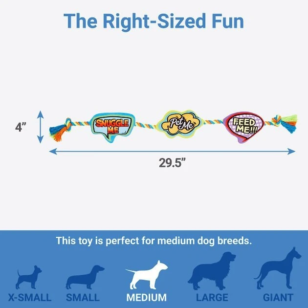 - Three, comic book-themed exclamation bubbles with plush covers attached to the rope toy.