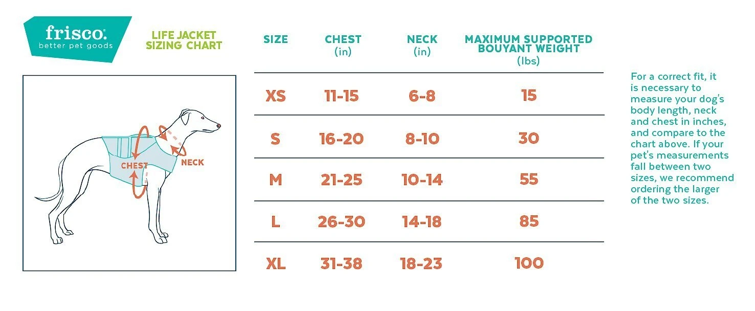 To find the right jacket for your pup, measure their chest, neck and weight. Then, compare their measurements to the size chart and the Maximum Buoyant Weight listed. To measure the chest girth you’ll measure at the broadest part of the chest behind the front legs and to measure for the neck girth you’ll measure at the broadest part of the neck. For the best fit, we recommend selecting the size based on your pet’s chest measurement. Once you have determined the correct size, you should then reference the weight the life jacket can safely support.
