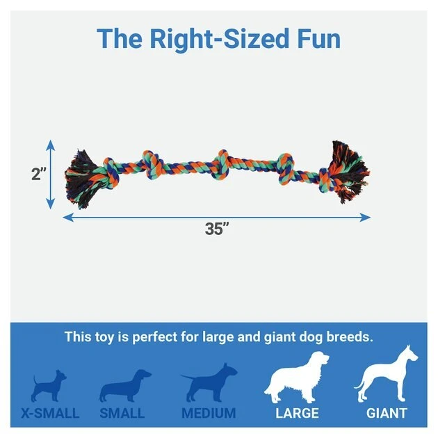 Let the games begin with this knotty, twisty, brightly colored fetch toy. This rope toy is made from a cotton/poly blend and is perfect for everyday play, at home or at the park. The knots add the fun variety dogs love, and make it easy to grip, too. Bring out the big dogsโthis oversized rope toy is specially sized for larger breeds.