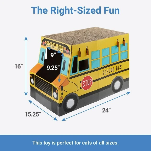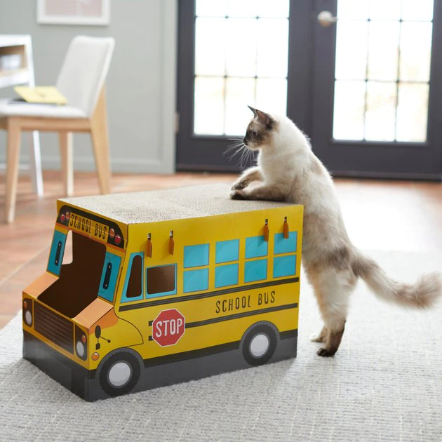 Itโs your kittyโs first day of school, so donโt let them miss the bus. Pickup is wherever your kitty likes! This school bus is made with corrugated cardboard, the best material on Earth for cats, according to cats. That means kitty can scratch happy on their way to school. Complete with little windows for kitty to peek out from, itโs the perfect play and nap spot on wheels, all in one.