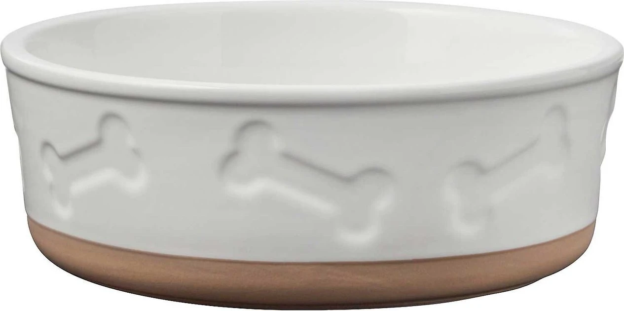 - Clean, white ceramic dog bowl with debossed bones around the outside.