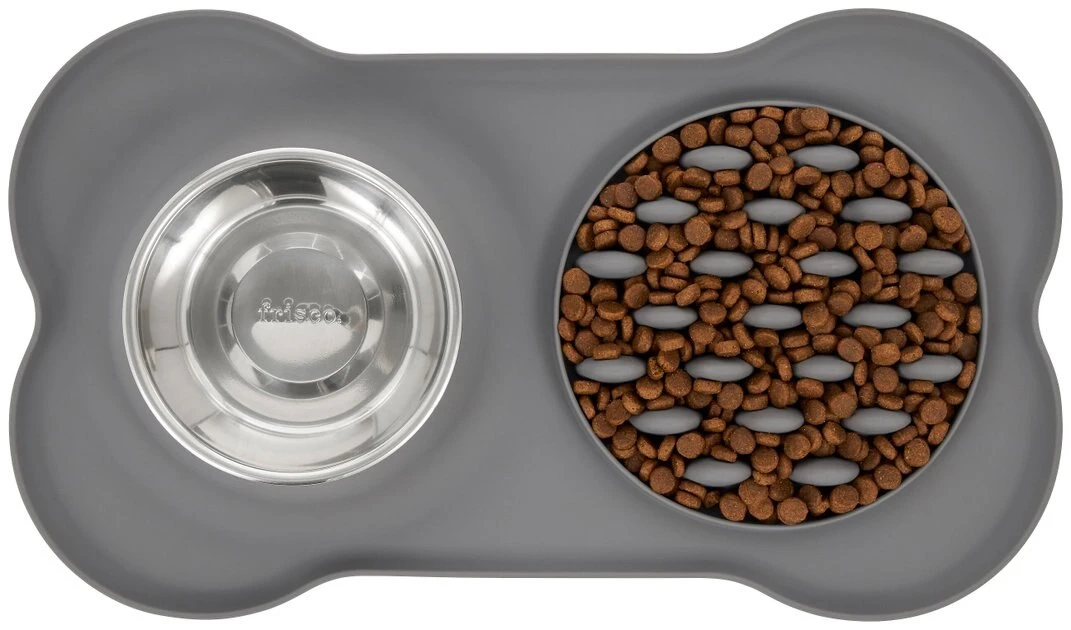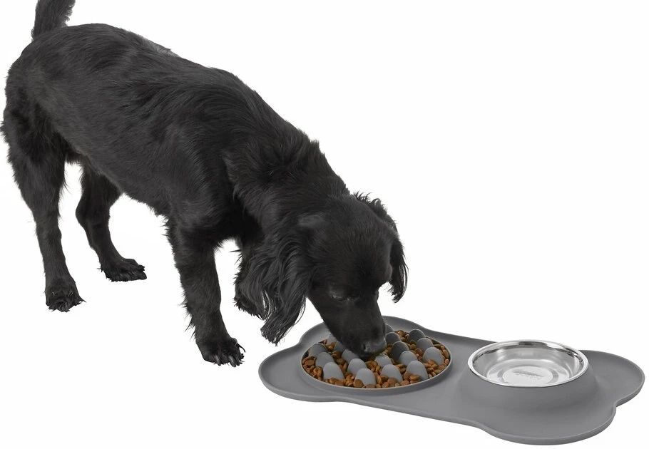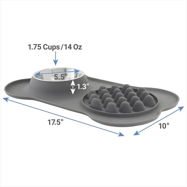 Is your dog a speed eater at meal time? The Frisco Silicone Slow Feeder Mat with Stainless Steel Bowl is an all-in-one solution to promote slower eating for your pup. This silicone mat features raised edges to prevent food and water from spilling over. Plus, the removable stainless steel bowl is top-rack dishwasher safe for easy cleaning so it can always be ready for your canine companion.