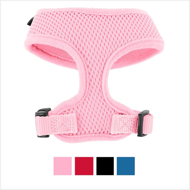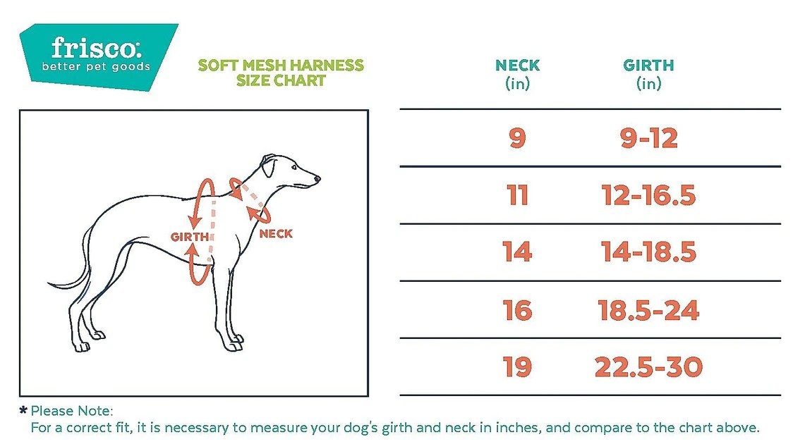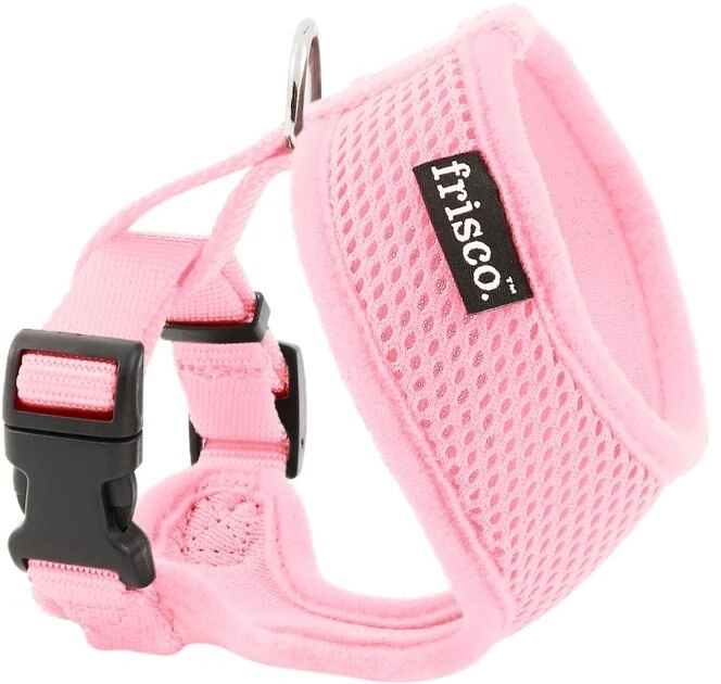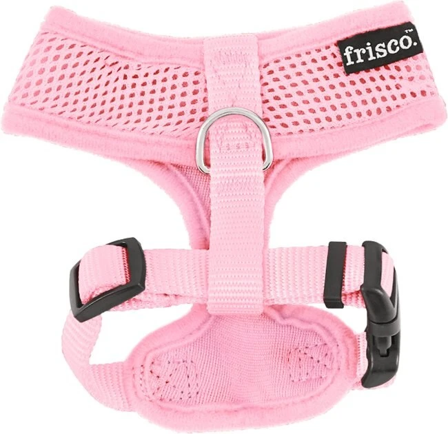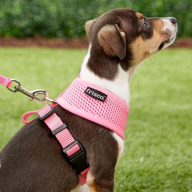 Remember to measure your pet for the paw-fect fit. The Frisco Soft Mesh Dog Harness provides pet parents with a soft, easy-to-use harness. Made with breathable mesh material, this harness will help your pet stay comfy and cool while out on their everyday walks. The over-the-head design and fast-release buckle make it easy to get on and off, while the adjustable slide on the belly strap ensures that you get the perfect fit to keep your pup secure. The D-ring at the back of the harness is secured using durable nylon fabric for you to attach your leash to, so you will always feel in control. This soft mesh dog harness comes in sizes from small to extra-large, and in four different colorsโpink, red, blue and blackโso you can choose the one that best suits your pup and their style.